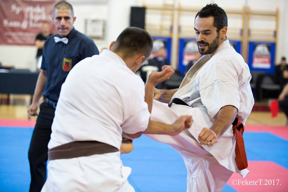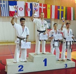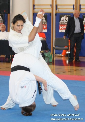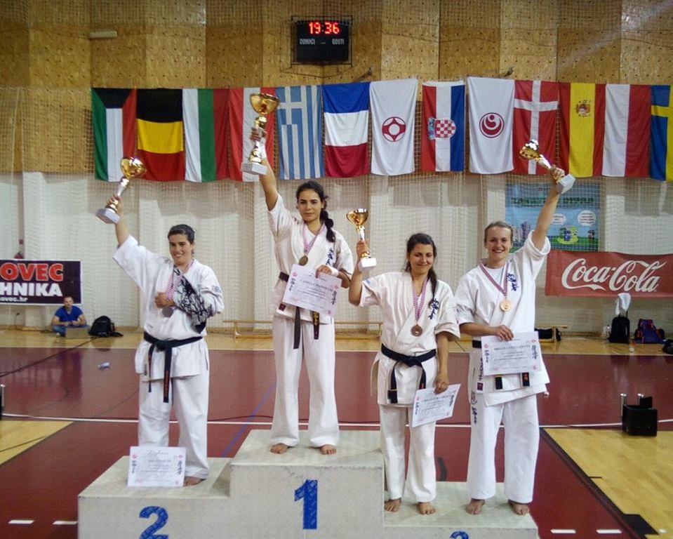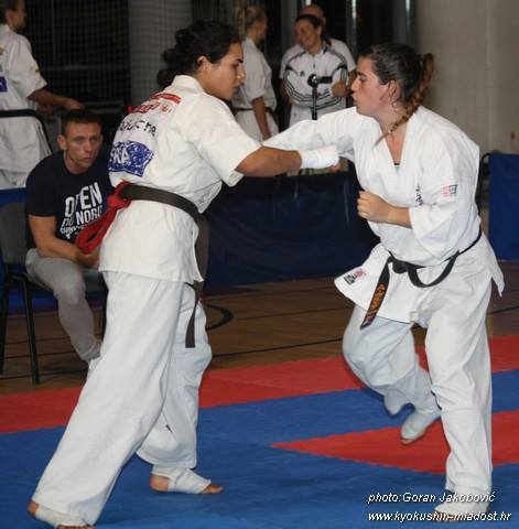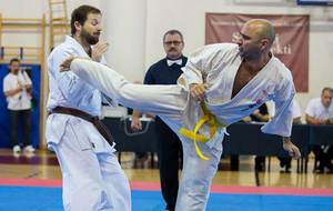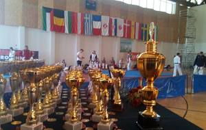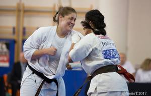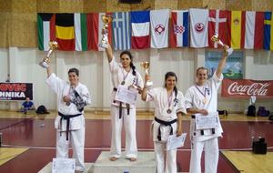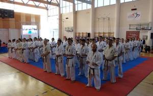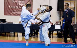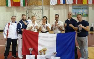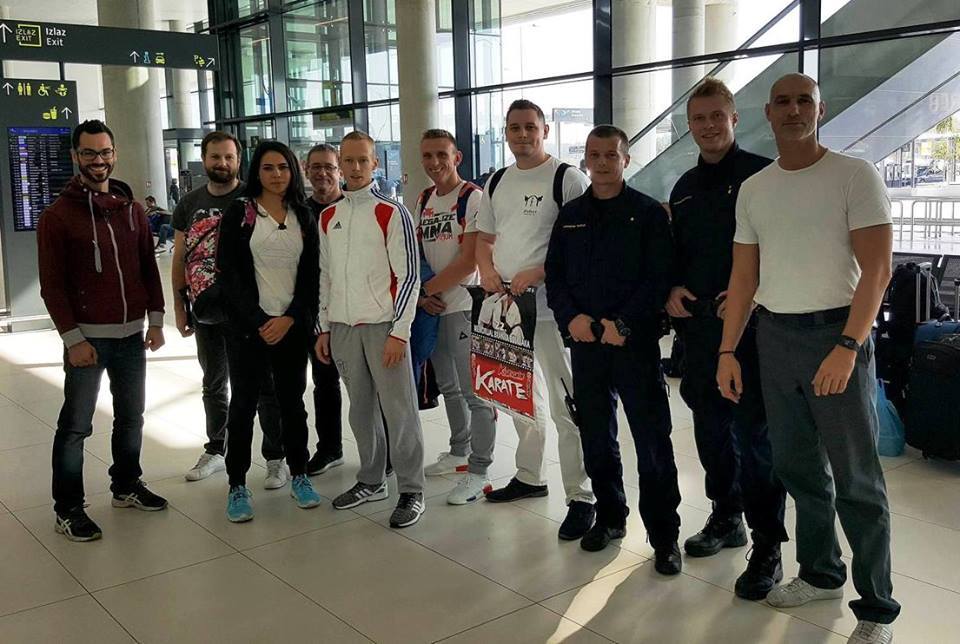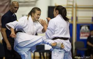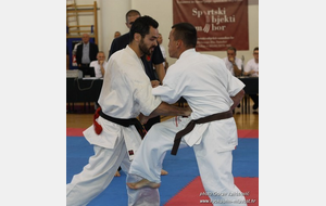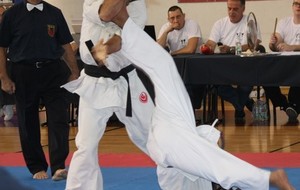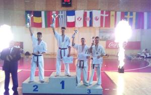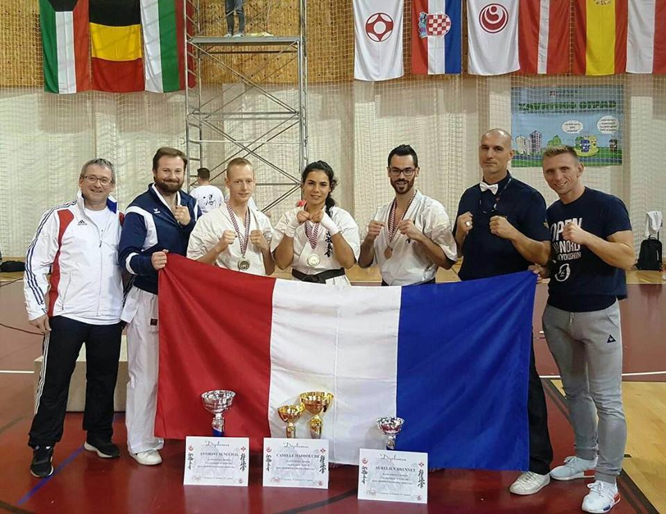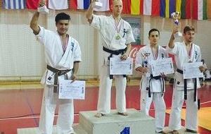 SAMEDI 14 OCTOBRE 2017, a eu lieu l'Open de Croatie organisé par Shihan Milan Garasic, auquel participait une délégation de FSKO. Un accueil exceptionnel avec une welcome party le vendredi soir, suivie d'un draw organisé en présence de tous les officiels. Celui-ci n'est pas particulièrement favorable aux Français, car Camille Had de l'ASO (filles HW) et Aurélien Brennet du Nintai Dojo (-75) ont un tour supplémentaire. Anthony Sénéchal (ASO) à l'inverse étant tête de liste, est directement en 1/2 finales mais dans une cat des -65 avec un niveau exceptionnel. Damien Varasse (Nintai) en -85, sera opposé au 1er tour à un Grec. Olivier Vity (Pres FSKO Marcilly) s'occupera comme à son habitude à filmer le tournoi, Johnny Desmedt à coacher ses combattants et Sébastien Vanroyen à coacher les siens et à arbitrer. Aure Brownie appelé le 1er, gagne son combat en 2 rounds face à un combattant croate. Damien gagne son combat en 2 R également face au Grec. Camille se débarasse en 2R d'une bonne combattante suédoise. Aure Brownie gagne ensuite contre un combattant koweïtien là encore en 2R et se trouve en 1/2! Camille Had est opposée à une Croate bien plus imposante et il faudra attendre les 2 R pour une victoire au poids (+20kilos d'écart). Elle est donc elle aussi en 1/2! Dam Niennien est opposé à une tête de liste, combattant hongrois exceptionnel. Il tente sa chance, amène quelques bons gedan, mais se fait surprendre au corps. Il sort grandi de ce tournoi. Aure Brownie est ensuite opposé à un autre combattant magyar et se fait lui aussi surprendre mais par un mawashi jodan. Ces deux combattants seront les futurs vainqueurs de leur catégorie. Anthony Sénéchal est enfin appelé face à un combattant suédois d'origine bulgare, livre un superbe combat et gagne en toute logique malgré le très bon niveau de son adversaire. Camille est appelée face à une redoutable lituanienne, mais lui rend coup pour coup durant 3 R et gagne là encore à la balance. En finale, elle rencontre une combattante espagnole ayant bénéficié d'un tableau plus aisé et la domine jusqu'à ce que dans le 2ème R, cette dernière se blesse en retombant sur le bras. Camille obtient donc la 1ère place et le trophée du Best Spirit. Anthony est également 1er, vu que son adversaire blessé ne pourra combattre en finale. Aurelien est 3ème. Sébastien a été juge toute la journée, puis choisi pour être dans le tableau final et on lui a proposé d'arbitrer une des finales. Ce ut donc un week-end très positifs pour le shin français!!! A très vite dès ce we pour l'open de Touraine!! OSU. Sensei Sébastien Vanroyen, BC CR FSKO.