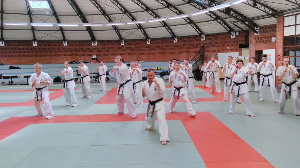Après le repas du midi, direction le superbe Dôme de Loos (salle de l’Open de France), où deux groupes par grade ont été formés, passant tour à tour avec Sensei Michiel VLEMINCK, qui a gentiment proposé de revoir les katas, tandis que Sensei Muzi a surpris tous les stagiaires en nous faisant réviser notamment les Renrakus !