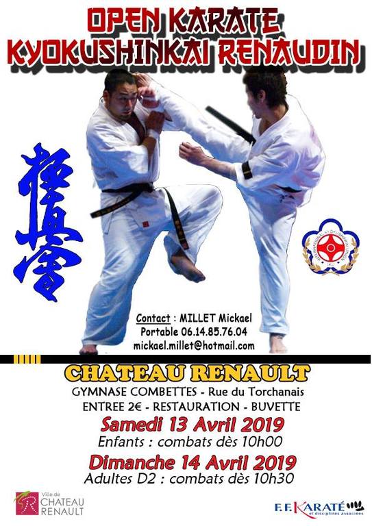 le club de karaté kyokushinkai renaudin (Chateau Renault) vous invite à son open renaudin qui se déroulera le samedi 13 avril pour les enfants et le dimanche 14 avril 2019 pour les adultes.