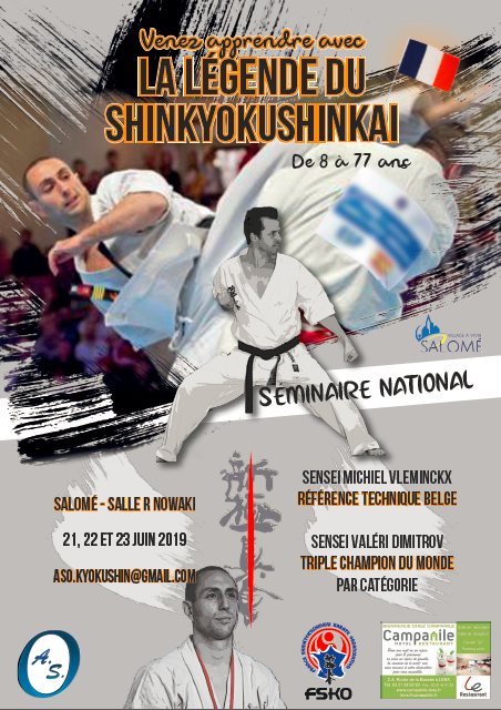 Nous avons le plaisir de vous convier à participer au séminaire national Shinkyokushinkai français 2019, ayant lieu à Salomé du vendredi 21 juin 19h au dimanche 23 juin 13h.